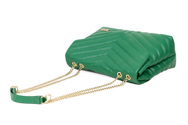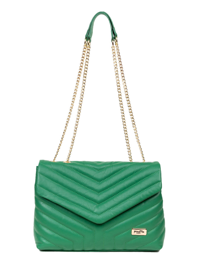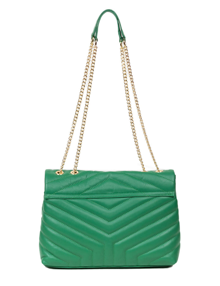 - It has two straps made of leather and a gold-colored metal chain.